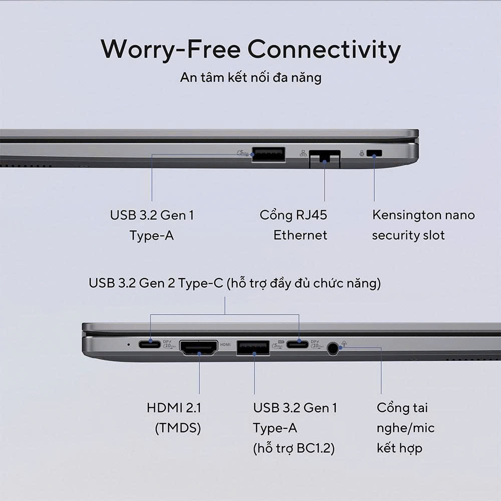 Bàn phím full-size có đèn nền và cụm phím số (numpad) là "chân ái" cho dân kế toán, tài chính. Hành trình phím 1.5mm cho cảm giác gõ nảy, chính xác, và tính năng chống tràn bảo vệ máy khỏi tai nạn bất ngờ. Hơn nữa, hãy nói "không" với dongle! P3605CVA được trang bị đầy đủ cổng kết nối, bao gồm 2 cổng USB-C 3.2 Gen 2 (hỗ trợ sạc và xuất hình), 2 cổng USB-A 3.2, HDMI 2.1 và đặc biệt là cổng mạng LAN RJ45 cho kết nối văn phòng ổn định. Webcam 1080p FHD đảm bảo bạn luôn xuất hiện chuyên nghiệp trong mọi cuộc họp.