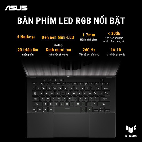 ASUS đã đầu tư rất kỹ lưỡng vào trải nghiệm nhập liệu trên TUF A14, bởi họ hiểu rằng đây là điểm tiếp xúc trực tiếp và thường xuyên nhất của người dùng.