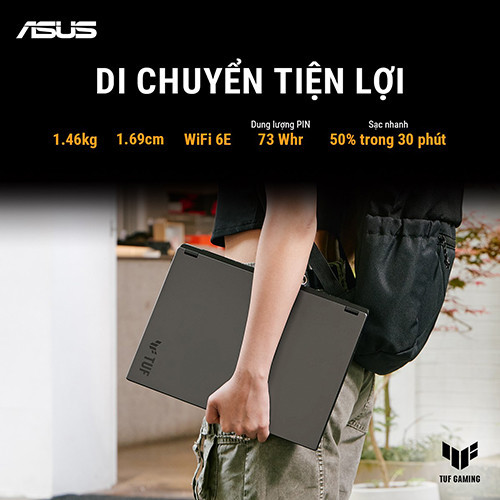 ASUS TUF Gaming A14 sở hữu thiết kế tối giản, hiện đại nhưng vẫn giữ được chất “TUF” cứng cáp với độ bền đạt chuẩn quân đội MIL-STD-810H. Trọng lượng nhẹ so với một chiếc laptop gaming hiệu năng cao, rất phù hợp cho người dùng thường xuyên di chuyển nhưng vẫn cần sức mạnh xử lý lớn.