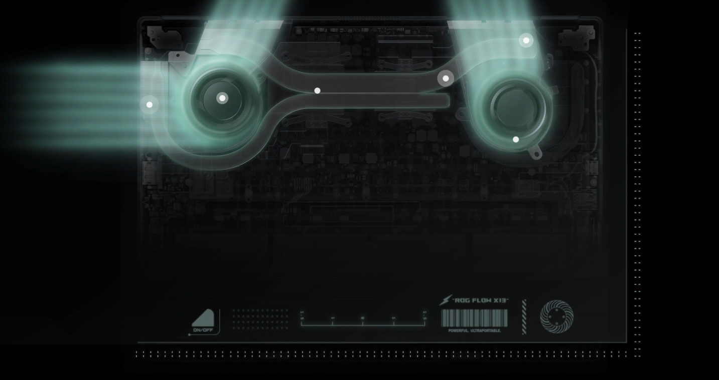 Dù thân máy rất nhỏ, Asus vẫn trang bị hệ thống tản nhiệt Arc Flow Fan + ống đồng lớn + keo tản nhiệt kim loại lỏng, giúp duy trì hiệu suất ổn định khi chơi game hoặc render nặng mà vẫn giữ độ ồn dễ chịu.