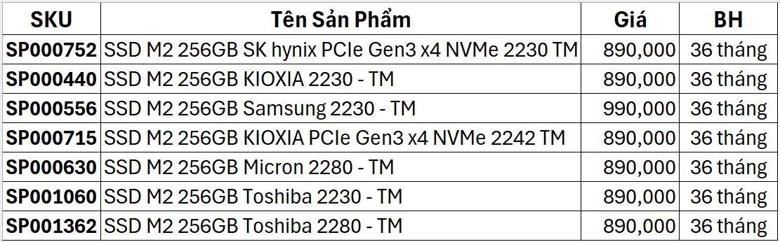 Danh sách ổ cứng SSD M2 các loại 2232/2242/2280 (WD, Samsung, Kingston, ...)